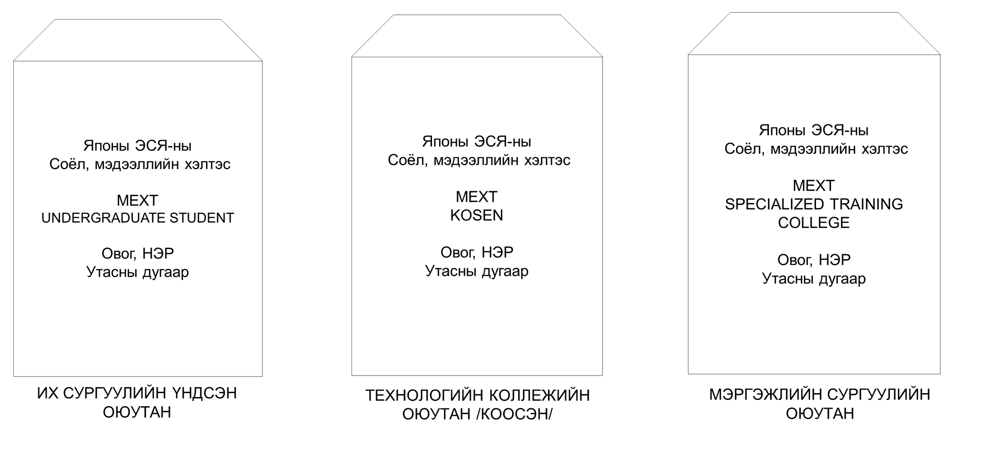 Япон Улсын Засгийн газрын тэтгэлэгт хөтөлбөрийн хүрээнд “ИХ СУРГУУЛИЙН ҮНДСЭН ОЮУТАН, ТЕХНОЛОГИЙН КОЛЛЕЖИЙН ОЮУТАН /КООСЭН/, МЭРГЭЖЛИЙН СУРГУУЛИЙН ОЮУТАН”-ы бүртгэл явуулах тул дараах удирдамж, холбогдох мэдээллийг сайтар уншиж танилцан бүртгүүлнэ үү.