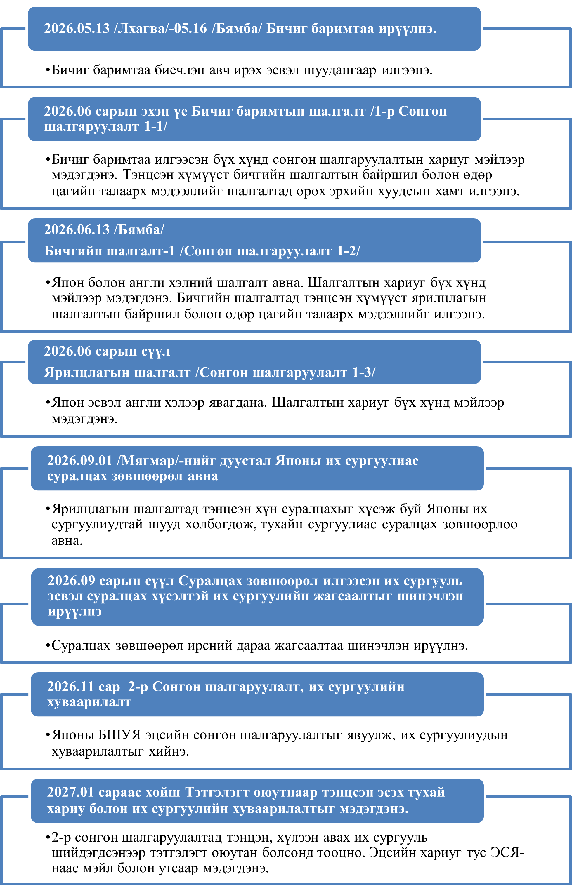⑶Бичиг баримтын шалгалтыг өргөдлийн агуулга, бичиг баримт бүрэн эсэхийг харгалзан үзэж явуулна. Ялангуяа, бичиг баримт дутуу, алдаатай байвал сонгон шалгаруулалтад тэнцээгүйд тооцохыг анхаарна уу. Харин “Эрүүл мэндийн шинжилгээний бичиг”-ийг зөвхөн ярилцлагын шалгалтад тэнцсэн хүн өгөх тул бүртгүүлэх үед хавсаргах шаардлагагүй.